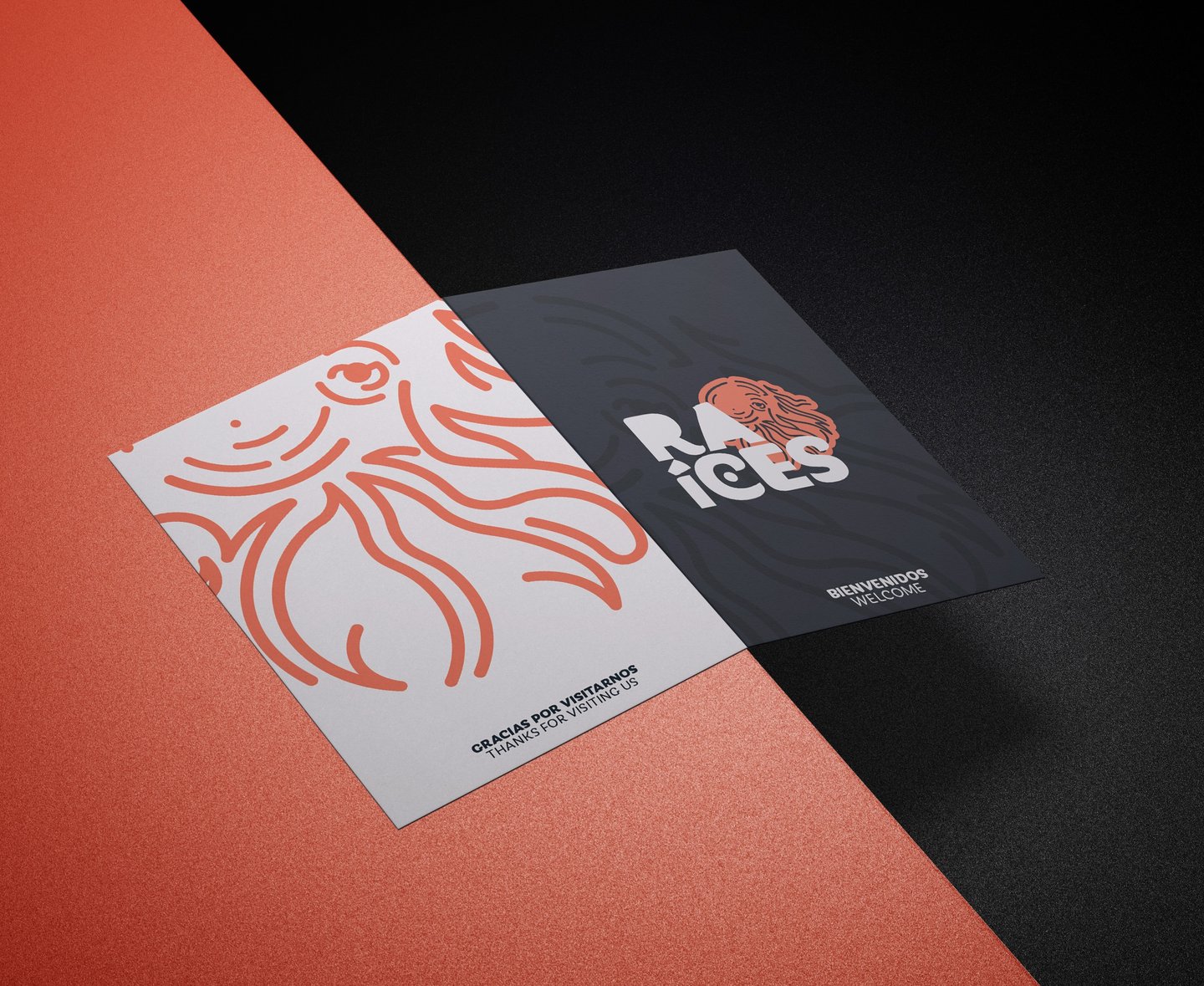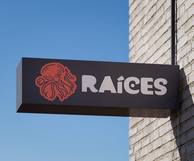 La identidad visual de Raíces nace de una propuesta que fusiona lo tradicional con lo contemporáneo, reflejando el espíritu del restaurante: una cocina que mezcla la gastronomía yucateca con los sabores del mar. La tipografía ISKRA Ultra Bold aporta carácter y autenticidad con sus trazos asimétricos y su estética artesanal, mientras que Nunito Sans ofrece claridad y calidez para los textos funcionales. La paleta cromática, compuesta por azul, coral y blanco, representa la dualidad entre mar y tierra, fuego y agua, evocando la idea de fusión que guía la experiencia culinaria. Finalmente, el isotipo retoma al pulpo maya como símbolo de la conexión entre cultura y naturaleza, un elemento clave en la vida de Telchac Puerto. De forma sutil, sus tentáculos dibujan la palabra “Máasewal” —nativo en lengua maya—, reforzando el vínculo con las raíces del territorio y convirtiendo al símbolo en una pieza memorable, cargada de identidad y sentido.